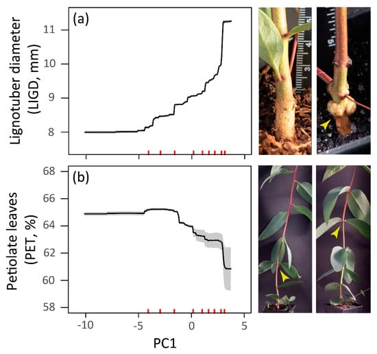 Partial dependency plots from the final extended forests models fitted as a function of climate principal components and Moran’s eigenvector map variables. The plots show the marginal effect of the climate principal component 1 (PC1; see Table S1) on the provenance estimates of marginal means for: (a) lignotuber diameter at the cotyledonary node (LIGD); and (b) percentage of nodes expanded at six months of age which had petiolate leaves (PET; lower values of PET pertain to seedling leaves that are more juvenile). The red tick marks show the deciles of the data. The grey shading indicates the 95% confidence intervals derived by iterative bootstrapping (1000 bootstraps). Increasing scores on PC1 corresponds to increasing home-site aridity (i.e., high summer temperatures and low summer rainfall; see Table S1). The images show the development of the basal lignotuber in the top panel (yellow arrow), and the ontogenetic change from opposite, sessile (bottom) to alternate, petiolate (top) leaves in the lower panel. The yellow arrow at the bottom panel corresponds to the node of the first petiolate leaf (node 4, left; node 6, right).