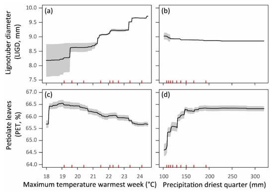 Partial dependency plots from the final extended forests models fitted as a function of specific climate variables and Moran’s eigenvector map variables. The plots show the marginal effects of maximum temperature of the warmest week (TMXWW) and precipitation of the driest quarter (RDRYQ) for each of the extended forests models applied for: (a,b) lignotuber diameter at the cotyledonary node (LIGD); and (c,d) percentage of nodes expanded at six months of age which had petiolate leaves (PET). The importance of the climate variables in the different models is given in Figure 4.