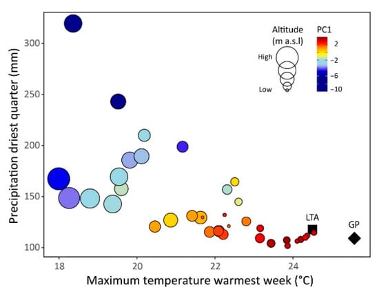The provenance home-site maximum temperature of the warmest week (TMXWW) plotted against the precipitation of the driest quarter (RDRYQ). Increasing circle size pertains to increasing provenance home-site altitude (meters above sea level). The colour of each circle reflects the provenance score along the climate principal component 1 (PC1; see Table S1), such that mesic provenances are dark blue (more negative values on PC1) and arid provenances are dark red (more positive values on PC1). The TMXWW and RDRYQ values for the contemporary (LTA: 1976–2005, centred on 1990) and growing (GP: 2014–2018) climate periods at the trial site are indicated. All provenances are from home-sites with a contemporary climate cooler than the growing period TMXWW, but seven provenances originate from home-sites with a contemporary climate drier than the growing period RDRYQ.