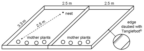 A serious problem of studies testing these hypotheses is the complexity and unpredictability of environmental variables, which affect myrmecochorous plants in the field, while the benefits for ants can be studied easily in laboratory experiments. Thus, it has been shown experimentally that ants may gain nutritional benefits from elaiosomes through which colony growth or sexual production is facilitated [2,3,4,5,6]. However, related studies concerning the investigation of the benefits for plants under controlled conditions are currently lacking. Such studies should provide the opportunity to capture the fate of adult plants, their seeds, and emerging seedlings in a given population [7].