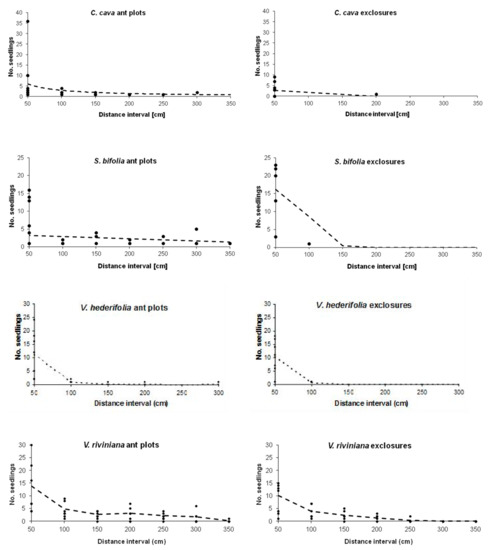 In our study, about one fourth of C. cava seedlings were dispersed beyond 50 cm, resembling the observations of Ohkawara et al. [44] who counted that 11% of Corydalis ambigua Cham. & Schltdl. seeds dispersed from mother plants by different ant species in a Japanese forest. The same study also lists a proportion of 46% of seeds recovered in ant nests. This pattern was not found in our study system as we observed a highly scattered seedling distribution of C. cava seeds with Myrmica, and we could not find any remaining seeds in the nests. However, seeds may have been stored or buried in the nests without the chance to germinate, so that those seeds would have lost their germinability as the germination capacity of large seeds decreases rapidly with time [45].