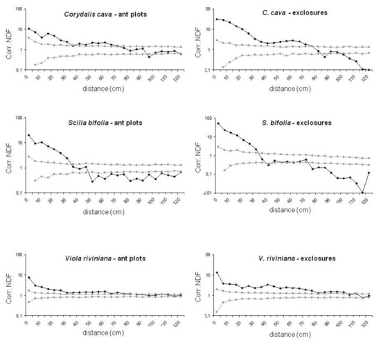 Corrected neighborhood density function (NDF) of Corydalis cava, Scilla bifolia, and Viola riviniana in ant plots and in exclosures. The black line represents the corrected NDF dependent on distance and the grey lines represent the 99% confidence interval for random distribution.