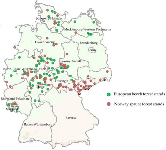 - Wellbrock, N.; Bolte, A.; Flessa, H. (Eds.) Dynamik und räumliche Muster Forstlicher Standorte in Deutschland. Ergebnisse der Bodenzustandserhebung im Wald 2006 bis 2008; Johann Heinrich von Thünen-Institut: Braunschweig, Germany, 2016; ISBN 978-3-86576-161-3. [Google Scholar]