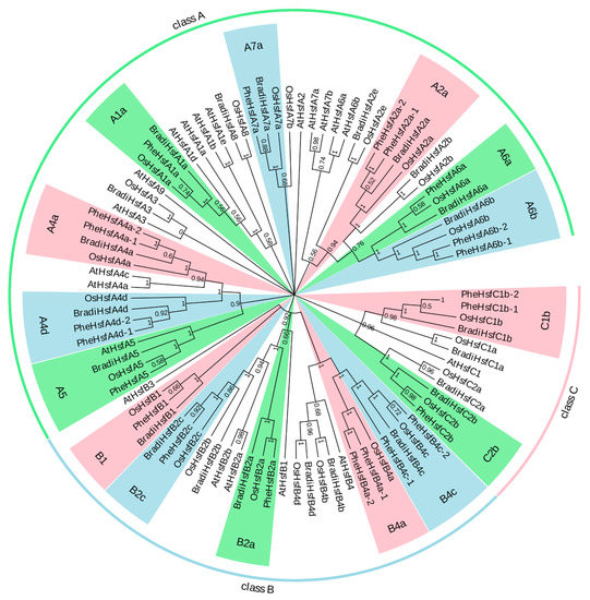 To predict the potential function, an unrooted phylogenetic tree was constructed from an alignment of 94 full length Hsf protein sequences from different species (23 AtHsf, 25 OsHsf, 24 BdHsf, and 22 PheHsf) (Figure 1). Because the alignment results of Hsf proteins in moso bamboo using ClustalX 1.83, MUSCLE, and Clustal Omega were similar, we employed the results of ClustalX 1.83 and MEGA7.0 to illustrate the phylogenetic relationships of the PheHsf family. The PheHsf genes were also grouped into three subgroups, including class A (PheHsfA1a, PheHsfA2a-1, PheHsfA2a-2, PheHsfA4a-1, PheHsfA4a-2, PheHsfA4d-1, PheHsfA4d-2, PheHsfA6b-2, PheHsfA6b-1, PheHsfA6a, PheHsfA5, and PheHsfA7a), class B (PheHsfB1, PheHsfB2a, PheHsfB2c, PheHsfB4c-1, PheHsfB4c-2, PheHsfB4a-2, and PheHsfB4a-1), and class C (PheHsfC1b-1, PheHsfC1b-2, and PheHsfC2b), which is similar to that described in Arabidopsis [52], rice [38], and B. distachyon [53]. In moso bamboo, class A was the largest and consisted of 12 members from six subclasses, however, three subclasses (A3, A8, and A9) in this class were not detected. There were seven members in class B from subclasses B1, B2, and B4, but no members in subclass B3. Class C was the smallest, with only three members.