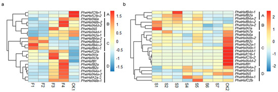 Based on the RNA-Seq data of different flowering developmental stages [43] and the internodes of shoots at different heights [1], a heat map was constructed according to the RPKM of 22 PheHsfs (Figure 2). During four flowering developmental stages of moso bamboo, PheHsf genes could be classified into four groups (A, B, C, and D) according to their relative expression levels (Figure 2a). Most of the PheHsfs were highly expressed (RPKM > 10) in at least one stage, and only four PheHsf genes were expressed at low levels (RPKM < 2) in at least two stages during floral development (Table S2). Four members (PheHsfB4a-1, PheHsf15, PheHsf12, and PheHsfB4c-1) of group C had higher transcript accumulation during two earlier stages (F1 and F2) and were downregulated at two later stages (F3 and F4 stage). Group D consisted of 10 PheHsf genes (PheHsfA4a-1, PheHsfB2c, PheHsfA1a, PheHsfA4a-2, PheHsfC2b, PheHsfA7a, PheHsfB2a, PheHsfA2a-2, PheHsfA6b-1, and PheHsfB1), and their expression levels steadily increased at the F3 and F4 stages. Group B comprised of six PheHsfs (PheHsfA4d-1, PheHsfA4d-2, PheHsfA5, PheHsfA6b-2, PheHsfA6a, and PheHsfA2a-1), showing higher transcript accumulation at two later stages (F3 and F4) and in the leaves. Group A only had two genes, PheHsfC1b-1 and PheHsfC1b-2, with expression levels six times and three times higher in leaves than the four stages of floral development, respectively. During shoot growth, Most PheHsfs (19/22) showed very low expression levels (RPKM < 8) at all seven stages, and only two genes (PheHsfA1a and PheHsfA6b-2) had higher expression levels (RPKM > 20) in at least one stage of bamboo shoot growth (Table S3). Based on the expression profiles, the PheHsfs were classified into four groups (Figure 2b). Among these, PheHsfA1a and PheHsfA2a-2 were clustered into the same group with continuous down-regulated expression from the S1 to S7 stage. However, PheHsfA6b-2 and PheHsfB2c were clustered in the same group, which showed twin peaks during the S2 and S5 stage, respectively.