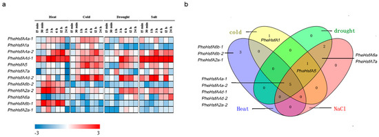 The expression of 12 PheHsfAs were analyzed by qRT-PCR under four abiotic stresses: high temperature, cold, drought and salt (Figure 3). The expression levels of all members of subclass A were upregulated (>2 folds) after at least one treatment (Table S4, Figure 3b). For heat stress, eight PheHsfAs were upregulated (>2 folds). PheHsfA4d-1, PheHsfA2a-2, and PheHsfA6b-1 rapidly responded to high temperatures, showing upregulation up to ~nine-fold within 0–1 h of 42 °C (Table S4) treatment. Among these, PheHsfA2a-2 (~22-fold higher than the control) was the most strongly induced gene. For cold stress, the expression levels of seven PheHsfAs (PheHsfA4a-1, PheHsfA1a, PheHsfA4a-2, PheHsfA4d-2, PheHsfA4d-2, PheHsfA5 and PheHsfA2a-2) were at least two-fold greater than the control for at least one of the time points. For drought and salt stress, eight PheHsfAs (PheHsfA4a-1, PheHsfA4a-2, PheHsfA4d-1, PheHsfA4d-2, PheHsfA5, PheHsfA7a, and PheHsfA6a) were upregulated. The expression level of PheHsfA4d-2 was ~20-fold higher than control after 3 h of 20% PEG treatment. The expression level of PheHsfA4d-1 was ~70-fold higher than the control after 3 h of 200 mM NaCl treatment (Table S4). Among the PheHsfA genes, five genes (PheHsfA4a-1, PheHsfA4a-2, PheHsfA4d-1, PheHsfA4d-2, and PheHsfA2a-2) were upregulated relative to the control treatment. (Figure 3b). These findings indicate that these genes might play vital roles in different stress response pathways.