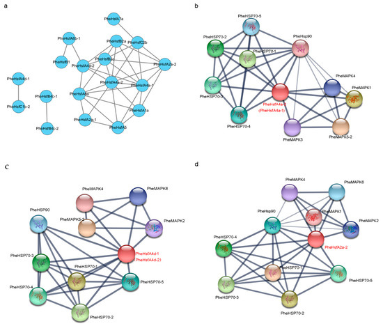 To identify the two PheHsfA4a-associated proteins and protein complexes, prediction networks were built with STRING (http://www.string-db.org/) based on the interaction network of rice orthologous genes (Figure 4b). Because the rice orthologous gene of both PheHsfA4a-1 and PheHsfA4a-2 were OsHsfA4a, the identified moso bamboo proteins predicted to participate in the interaction network with PheHsfA4a-1 and PheHsfA4a-2 were the same. They interacted directly with 10 identified proteins, including five HSP70 proteins, one HSP90 protein, and four MAPK proteins. Because PheHsfA2a-2 (~22-fold higher than the control), PheHsfA4d-2 (~20-fold higher than the control) and PheHsfA4d-1 (~79-fold higher than the control) were strongly induced by heat, drought and NaCl stress, respectively. We also identified the two PheHsfA4d- and PheHsfA2a-2- associated proteins and protein complexes, and PheHsfA4ds and PheHsfA2a-2 were also predicted to interact with HSP70 proteins, HSP90 protein, and MAPK proteins (Figure 4c,d).