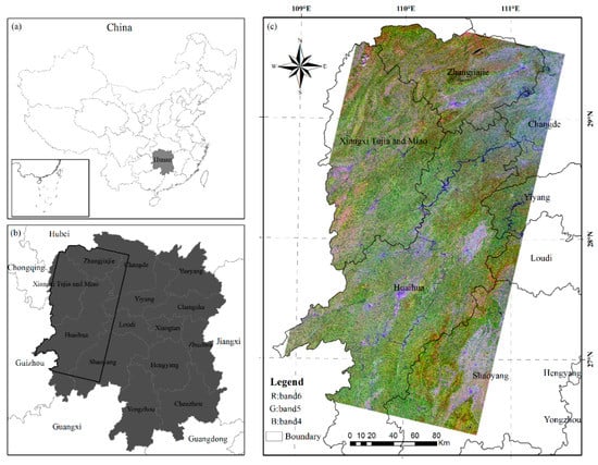 The location of study area: (a) The study area location in China; (b) the western Hunan in Hunan province; and (c) a false color composite of Landsat 8 OLI band 6 in red, band 5 in green, and band 4 in blue.