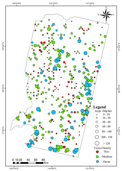 Spatial distribution of sampling plots corresponding to plots of aboveground biomass (AGB) values and crown density class across the western Hunan.