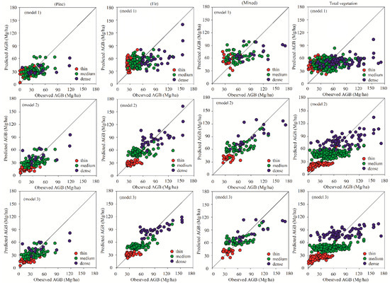 The fitting results of models 1–3 are summarized in Table 6 and Table 7. For the different vegetation types, the R2 and R2adj of model 2 and model 3 were larger than those of model 1, and the RMSE values were smaller than those of model 1. These results indicate that the performances of model 2 and model 3 were better than that of model 1. The R2adj of model 2 and model 3 for pine forest had the smallest increase compared with model 1; the value of R2adj increased by 0.16, and the RMSE values were smaller for model 2 and model 3 than for model 1. For the fir forest, model 2 and model 3 had the largest R2adj values, and compared with model 1, the values increased more than 0.39. For the mixed forest and total vegetation, the R2adj and RMSE values of model 2 and model 3 were better than those of model 1. These results show that model 2 and model 3, which were considered the crown density classes, had higher accuracies of AGB estimation than model 1.