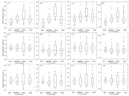 Residual boxplots of AGB of model 1, model 2, and model 3 for different vegetation types among different crown density classes: (A–D) represents pine forest, fir forest, mixed forest, and total vegetation, respectively (model 1—linear regression model; model 2—linear dummy variable model; model 3—linear mixed-effects model; ** indicates that the residuals were significantly different from 0 at the 0.01 level; * indicates that the residuals were significantly different from 0 at the 0.05 level).