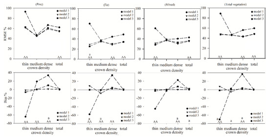 Comparison of root mean square error percent (RMSE%) and Bias percent (Bias%) results at different crown density classes of models 1–3 for pine forest, fir forest, mixed forest, and total vegetation. The significant differences between model 1 and model 2, and model 1 and model 3 for RMSE% and Bias% are expressed in capital letters (AA), and the lowercase letter (a) represents significant differences between model 2 and model 3.