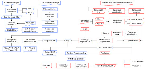 Figure 3 displays a flow chart of the methods we used in this study. These methods can be divided into four sections. First, we derived a DSM from the ZY-3 stereo images and subtracted the SRTMGL1 to obtain a crude CHM. We then applied a series of refining measures to the crude CHM, including the masking of non-forest areas using land-cover classification results obtained from the ZY-3 multi-spectral image. Second, we correlated the refined CHM with the topographically corrected Landsat 8 surface reflectance data, the vegetation indices, and the forest types using a Random Forest regression model. Third, we extrapolated the model to the entire study area covered by the Landsat 8 data. Finally, we compared our predicted forest canopy height with the mean forest height measured in the field survey plots.