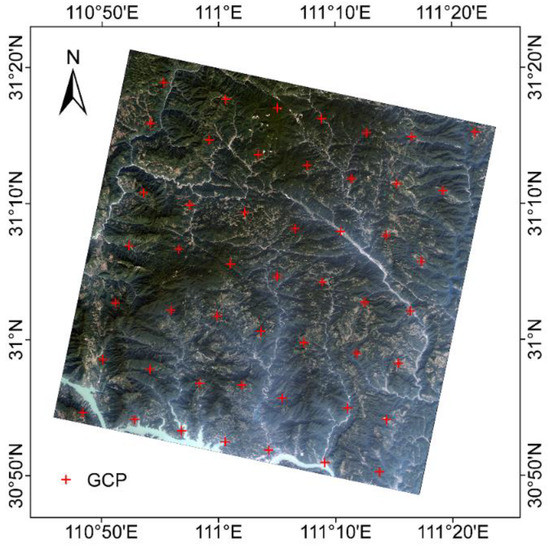 The GCPs and ZY-3 multi-spectral image. We set 49 GCPs manually in the vegetation-free areas and derived the elevation of the GCPs from the SRTMGL1.