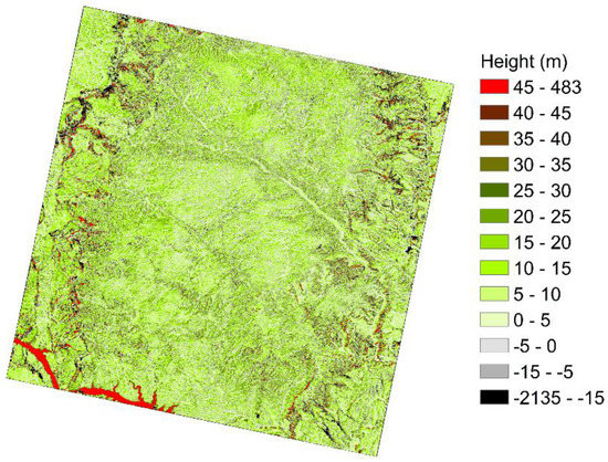 We also used the SRTMGL1 as the DTM to extract the crude CHM in this study. The penetration capability of the SRTM C-radar was one of the main reasons for this choice. There are also several other near-global terrain data available [43]. The ASTER Global Digital Elevation Model (GDEM) and ALOS World 3D-30 m DEM (AW3D30) are based on optical stereo images from multiple periods and cannot penetrate the forest, in principle. The terrain data produced by the TerraSAR-X add-on for Digital Elevation Measurements (TanDEM-X) mission are also DSMs because the X-band radar beam can hardly penetrate the canopy [44,45]. It was reported that the phase center of the SRTM C-radar is located above the ground in many cases, but specific analysis is required. Forest height, structure, and density all influence penetration depth. Studies have shown that the SRTM radar phase center can still reach the land surface if the forest height is relatively low (e.g., less than 30 m, as was the case in our study area) [39,46]. In addition, the SRTM radar beam should penetrate deeper in leaf-off seasons (i.e., February 11 to February 22, 2000), because during these times, the bare land surface is visible even in optical images. If the phase center is close to the land surface, or the penetration depth increases as the height of the forest increases, using the SRTMGL1 as a DTM remains worthwhile.