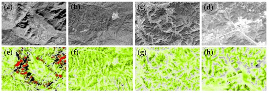In the crude CHM, forests with canopy heights larger than 15 m are mostly concentrated in the north and mid-west. This corresponds to the locations of protected areas and scenic spots. Subgraphs (b) and (f), (c) and (g), and (d) and (h) in Figure 6 show the vertical information of different surface objects, such as forest patches and new houses.