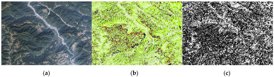 The slope difference mask. Subgraph (a) shows the ZY-3 multi-spectral image of the demonstration area. Subgraph (b) shows the crude CHM that was contaminated by terrain fluctuations (the legend is the same as Figure 5’s). Subgraph (c) shows the slope difference mask. We only preserved the areas with slope differences less than 4.5° (displayed in white). The 4.5° threshold was a compromise option to minimize the interferences from terrain, while retaining enough samples.