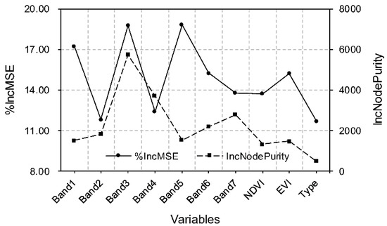 As Figure 11 shows, band5 (Near infrared band) and band3 (Green band) were the most important variables in the Random Forest model. Band5 had the highest %IncMSE (18.84%) and band3 had the most significant impact on the IncNodePurity. Band1 (Coastal/Aerosol band) and band4 (Red band) also had relatively high levels of %IncMSE, and IncNodePurity, respectively.