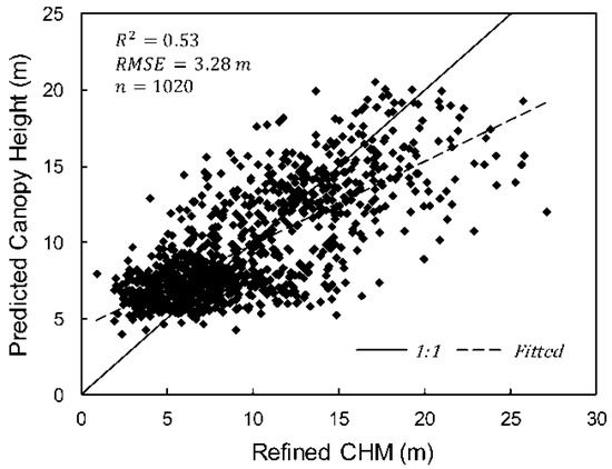 We performed a piecewise averaging of all samples to reveal the relationships between predictor variables and refined CHM (Appendix A). It was found that, with the increase of the refined CHM, the reflectance of all bands showed a downward trend, and the NDVI and EVI showed upward trends. Evergreen forests usually accounted for larger proportions in the groups with higher refined CHMs. We used out-of-bag estimation to evaluate the Random Forest regression model. The canopy height of each sample was predicted, based on about 1/3 of the regression trees. The estimation showed a coefficient of determination (R2) of 0.53 and a root mean square error (RMSE) of 3.28 m (Figure 12).