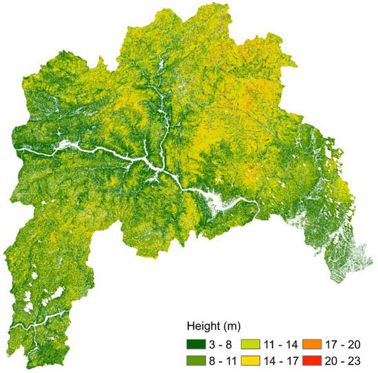 Forest canopy height refers to the mean height of the top surface of a forest’s canopy. It is useful in studying biodiversity and the carbon cycle. Many studies have mapped forest canopy height using remote sensing data [1,2,3,4,5,6,7,8,9]. The majority of these are based on the light detection and ranging (LiDAR), synthetic aperture radar (SAR) or digital photogrammetry (DP) techniques [5,8,10].
