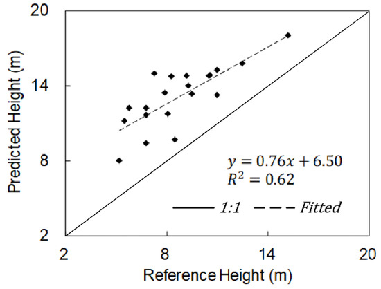 Before validation, we averaged the predicted forest canopy height in a 4 × 4 pixel window around the GPS position of each survey plot to reduce the effects of GPS positioning errors and the residuals of topographic correction. The validation result (Figure 15) showed an R2 of 0.62 and a RMSE of 4.66 m. An offset of 6.5 m was observed. After compensating the offset, the RMSE dropped to 2.64 m.