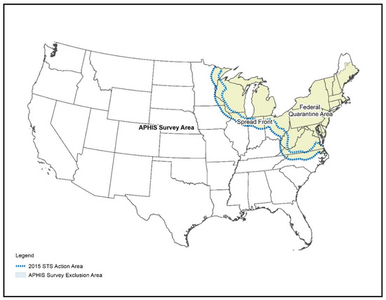 - USDA, Animal and Plant Health Inspection Service. Gypsy Moth Program Manual. First Edition ed. Plant Protection and Quarantine; 2010. Available online: http://www.aphis.usda.gov/import_export/plants/manuals/domestic/downloads/gypsy_moth.pdf (accessed on 10 November 2018).