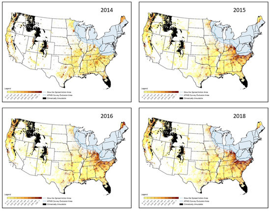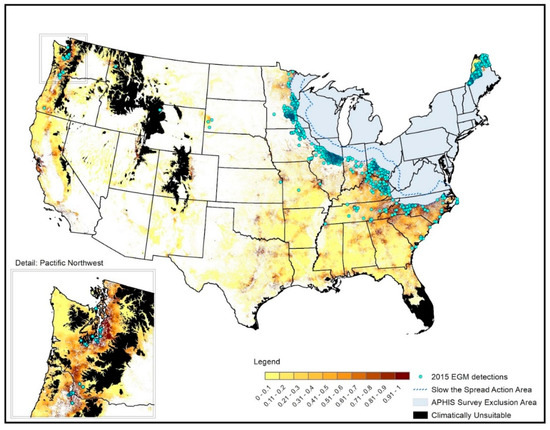 - Downing, M.C.; Withrow, J.R.; Leinwand, I.I.F.; Cook, G.L.; Kennaway, L.F.; Jarnevich, C.; Sapio, F.J. European Gypsy Moth Lymantria Dispar Dispar Establishment Suitability for 2014; USDA Forest Service, Forest Health Assessment and Applied Sciences Team: Fort Collins, CO, USA, 2014. Available online: https://www.fs.fed.us/foresthealth/technology/pdfs/European_Gyspy_Moth_Establishement_Map_Summary.pdf (accessed on 10 November 2018).