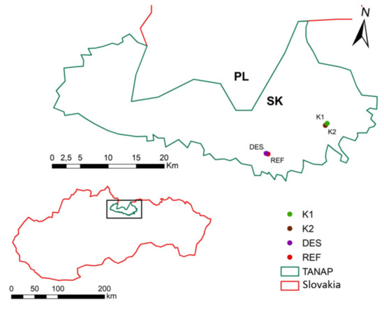 Map of research area; Tatra Mountains National Park, Slovakia (TANAP). Four types of forest: K1 = attacked by bark beetle; K2 = destroyed by bark beetle; DES = with removed trees; REF = mature.