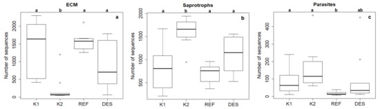 Differences in fungal trophic group abundance based on the number of sequences: (a) ECM fungi, (b) saprotrophic fungi, and (c) parasitic fungi detected in forest that is attacked by bark beetle (K1), destroyed by bark beetle (K2), with removed trees (DES), and mature (REF). The diagrams represent median, quartiles, and range (1.5 * IQR) from 10 microsites.