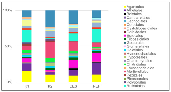 The differences in fungal communities among forest types (Figure 3) were caused mainly by ECM orders (Figure 4), with Atheliales prevailing in REF (16% of sequences on average), but being substantially reduced in K2 (3%), along with Russulales (K1 18%, K2 1%, DES 11%, REF 19%). In contrast, Mortierellales containing saprotrophic species became more abundant in K2 (22%) and DES (13%), but less abundant in K1 and REF (6%). Eurotiales, including ectomycorrhizal, saprotrophic, and parasitic species, prevailed in DES (11%) and REF (12%) but decreased in K1 (6%) and K2 (2%).