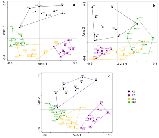 Principal component analysis (PCA) summarizing variation in the fungal community based on the number of sequences from 10 microsites per forest that is attacked by bark beetle (K1), destroyed by bark beetle (K2), with removed trees (DES), and mature (REF): (a) fungal sequence abundances; (b) ECM fungal sequence abundances; c) saprotroph sequence abundances.