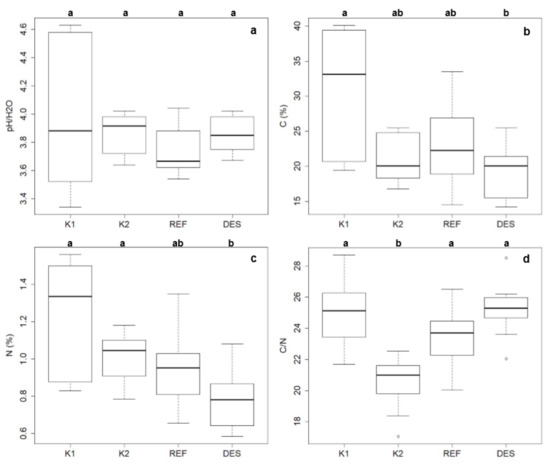 The organic soil was strongly acidic in all forest types, with a mean pH of 3.9 ± 0.3 (Figure 6a). Carbon and nitrogen concentrations were the highest (p < 0.05) in K1, whereas the lowest concentrations were in DES (Figure 6b,c). The highest C/N ratio was detected in K1 and DES with means of 25 ± 0.7 SE and 25 ± 0.5 SE, respectively (Figure 6d). The K1 forest had the highest within-microsite variability in all measured soil properties.