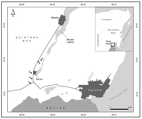 - Espinoza-Ávalos, J.; Islebe, G.A.; Hernández-Arana, H.A. El sistema ecológico de la Bahía de Chetumal/Corozal: Costa occidental del Mar Caribe; El Colegio de la Frontera Sur: Chetumal, Mexico, 2009; ISBN 9786077637134. [Google Scholar]