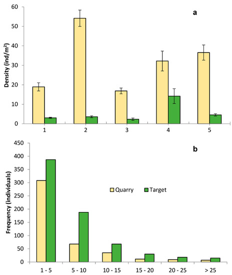 (a) The average density of individuals in each quarry and target vegetation. (b) Distribution in diametric classes of quarries (n = 438) and target vegetation (n = 706).