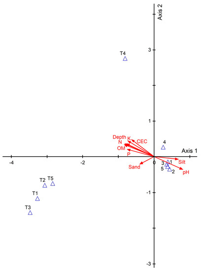 The canonical correspondence analysis (CCA) explained 60% of the total variance, with an eigenvalue of 0.89 for the first axis and 0.61 for the second axis, representing 36% and 25% of the total variance, respectively. The first axis is determined by the increase in the concentration of organic matter (OM), CEC, and percentage of sand. The second axis is determined by the increase in silt and pH (Figure 3). In Figure 3, the plots sampled in the quarries and target vegetation are presented. Most plots of the target vegetation (T1, T2, T3, T5) are grouped in the lower left; except for target vegetation 4 (T4) located in the upper left, which was characterized by showing the highest content of MO, nitrogen (N), phosphorus (P) and potassium (K). Regarding the plots of the quarries, most of the plots (1, 2, 3, 5) are grouped in the central part of the biplot; except 4, which presented better soil conditions given its distribution on axis 2. In general, it was observed that the quarries presented a soil with a slightly alkaline pH, unlike the target vegetation with a neutral pH and a higher percentage of silt.
