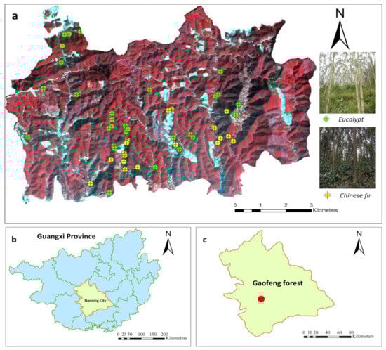 The location of the study site in Gaofeng Forest and sample plots distribution of two main tree species (Chinese fir and Eucalypt). (a) The Landsat 8 satellite image (June 2017) of study site; (b) the location of Nanning city; (c) the location of the Gaofeng forest.