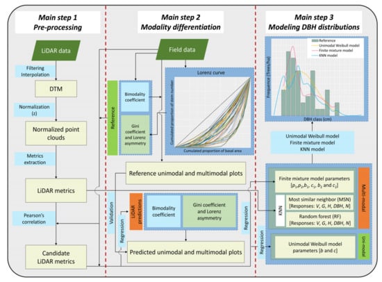 A workflow for predicting diameter distributions by airborne LiDAR data is shown in Figure 2. The workflow includes three main steps: Data pre-processing, modality differentiation and modeling diameter distributions. In step one, a 1 m Digital Terrain Model (DTM) was generated by calculating the average elevation of LiDAR ground returns within a rasterized cell grid. Metrics were then extracted from point clouds normalized by the DTM. In step two, field plots were classified as either unimodal or multimodal using a bimodality coefficient (BC). Then, the capability of BC, along with the Gini coefficient (GC) and Lorenz asymmetry (LA) predicted by LiDAR metrics were assessed to differentiate modality. In step three, the UWM and FMM were generated for diameter distributions of estimated unimodal and multimodal plots. For comparison, a KNN model was also employed for constructing diameter distributions using LiDAR-derived metrics. KNN diameter distribution prediction strategies, including number of neighbors (i.e., k), response configurations and imputation methods (i.e., MSN and RF) were also examined. Finally, the performance of LiDAR predicted diameter distributions was evaluated. These steps are described in further detail below.