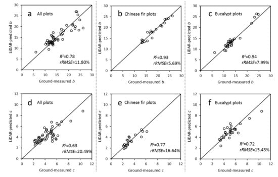 Accuracy results for LiDAR-predicted UWM parameters in undifferentiated plots using leave-one-out cross-validation are shown in Figure 3. The b and c for all plots had the lowest accuracies, whereas the b and c of Chinese fir models and that of Eucalypt models produced similar accuracies to one another. Figure 4 shows the cross-validation results of FMM parameters models in differentiated plots. For identified UWM plots, b and c produced same R2 values of 0.83, with RMSE of 12.73% and 14.76%, respectively. For FMM parameters, b2 obtained the highest accuracy, followed by b1, c1, p2, c2, and p2. Overall, the scale parameter models performed better than shape parameter models, indicating LiDAR metrics had a relatively high correlation with scale parameter.