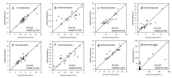 Scatter plot of cross-validations for the ground-measured UWM parameters and finite mixture model (FMM) parameters vs. the LiDAR-predicted UWM parameters and FMM parameters in differentiated unimodal plots and multimodal plots. (a,e) scale and shape of UWM of differentiated unimodal plots; (b,f) proportion of differentiated multimodal plots; (c,g) scale parameters of FMM of differentiated multimodal plots; (d,h) shape parameters of FMM of differentiated multimodal plots.