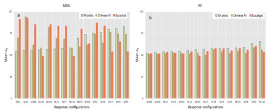 Reynolds error index for diameter distributions of different forest types by MSN (a) and RF (b) imputations of KNN with 15 response configurations. The response configurations in ascending order of the mean eR values of all plots; eR = Reynolds error index.