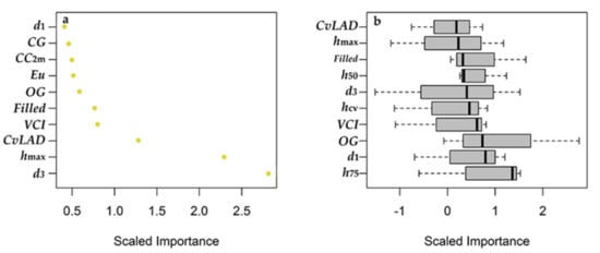 Figure 6 displays the scaled importance of top ten predictors that were used for two RF imputation models of Table 8. For the RF-imputed DBH model of all plots (Figure 6a), d3 was the most important variable in the DBH model, followed by the hmax, CvLAD, VCI, Filled, OG, Eu, CC2m and CG. d1 was the least important variable in the top ten variables. For SET7 responses employed in Chinese fir plots, the h75 was the most important metric (Figure 6b), followed by the d1, OG, VCI, hcv, d3, h50, Filled, hmax and CvLAD. For two RF imputation models, except Eu, CC2m and CG in Figure 6a, the other metrics were ranked among the top ten metrics (Figure 6b).