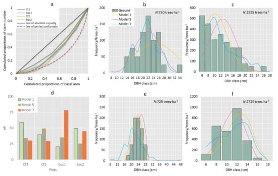 The ground diameter distributions of four differentiated unimodal sample plots with relative low (b,e) and high stem density (c,f) predicted by Model 1, Model 5 and Model 7. (a) The LiDAR-predicted Lorenz curves of four sample plots; (b,c) Chinese fir plots; (e,f) Eucalypt plots; (d) The Reynolds error index of predicted diameter distributions of four sample plots. Notes: Cf1 and Cf2 = Chinese fir plot 1 (b) and 2 (c); Euc1 and Euc2 = Eucalypt plot 1 (e) and 2 (f); Model 1 = UWM for undifferentiated all plots; Model 5 = UWM for differentiated unimodal plots; Model 7 = KNN model for all plots.