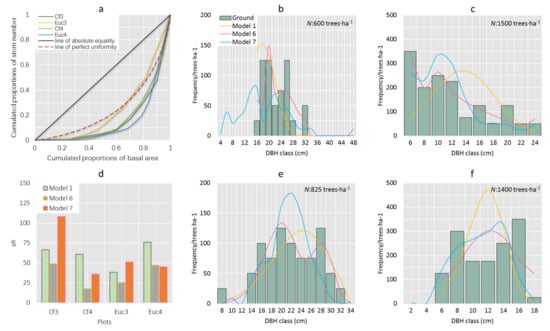 The ground diameter distributions of four differentiated multimodal sample plots with relative low (b,e) and high stem density (c,f) predicted by Model 1, Model 6 and Model 7. (a) The Lorenz curves of four sample plots; (b,c) Chinese fir plots; (e,f) Eucalypt plots; (d) The Reynolds error index of predicted diameter distributions of four sample plots. Notes: Cf3 and Cf4 = Chinese fir plot 3 (b) and 4 (c); Euc3 and Euc4 = Eucalypt plot 3 (e) and 4 (f); Model 1 = Unimodal Weibull model for undifferentiated all plots; Model 6 = FMM for differentiated multimodal plots; Model 7 = KNN model for all plots.
