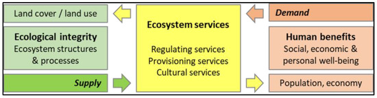 Interaction of ecosystem structures and processes (supply side) as well as ecosystem services and human well-being (demand side) [15] (p. 19, with alterations).