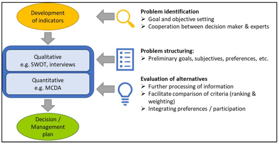 Combining different approaches (e.g., SWOT and multiple-criteria decision analysis, or MCDA) in a planning process [24] (p. 375, with alterations).