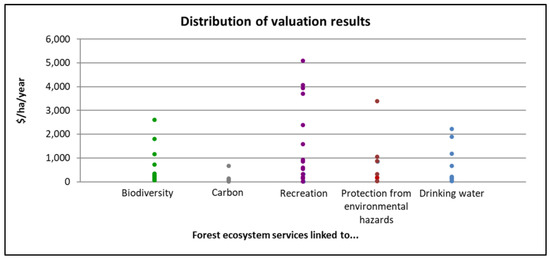 The database analysis showed a wide range of valuation results for all of the forest ES categories. Figure 5 provides an overview of the high dispersion of valuation results.