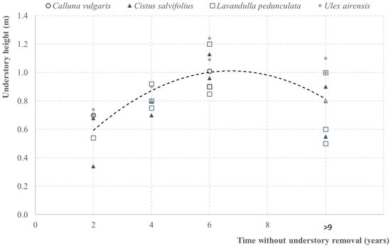 Stand understory layer was composed of spontaneous shrubs species dominated by Cistus salvifolius L. (25%), alongside with sparsely distributed Ulex airensis M.D. Esp.Santo, Cubas, Lousa, C.Pardo & J.C.Costa (15%), Lavandula pedunculata (Mill.) Cav. (10%), and Calluna vulgaris (L.) Hull (5%). Until 2003, the understory was mechanically removed with a forestry mulcher, in the complete stands area, with an interval of 3 to 4 years. In order to assess understory evolution with time, since 2012, for each of this shrub species, additional measurements of shrub height (m) were performed—a minimum of two samples per species—in the following years after clearing (TShrubs): 2, 4, 6 and more than 9 years in a similar neighboring stand. These measurements were used to develop a simple quadratic model, dependent of TShrubs, as in Navarro et al. [15], allowing the estimation of shrub height in intermediate years.