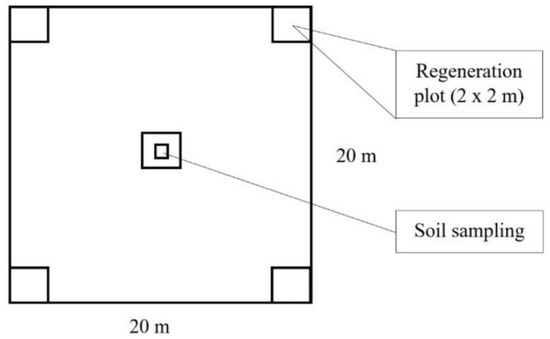 Design of a research plot (20 × 20 m). All trees in the plot were measured. Regeneration was assessed in each of the five regeneration plots (2 × 2 m). Soil sampling was carried out at the center of each research plot.