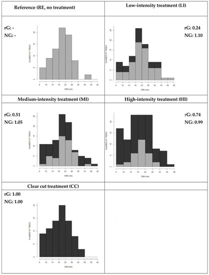 To gain a better understanding of the character of the different treatments, we analyzed the type and intensity of the logging events [45,46] carried out in February 1998. We assessed the selective logging weight (originally referred to as the thinning weight, or “rG ratio”; [47]), which represents the intensity of the selective logging. The selective logging type was quantified with the “NG ratio” (originally denoted as thinning type; [45]). The NG ratio indicates a thinning or selective logging from below if mostly suppressed trees were removed (NG values > 1), or from above if the dominant trees were removed (NG values < 1). NG values equal to one indicate that the number of removed stems was proportional to the removed basal area [45,48]: