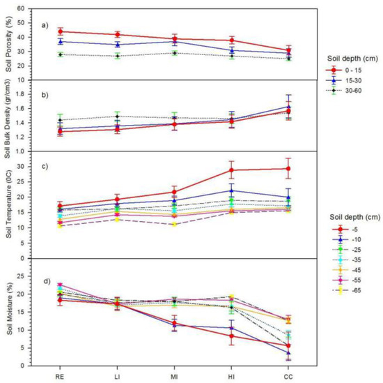 Overall, soil bulk density (r = 0.92), total soil porosity (r = −0.91), temperature (r = 0.87), and moisture content (r = −0.83) of the soil were highly correlated with logging intensity. Results of the assessment revealed that soil bulk density and temperature tended to increase with increasing logging intensity, whereas soil porosity and moisture content declined.